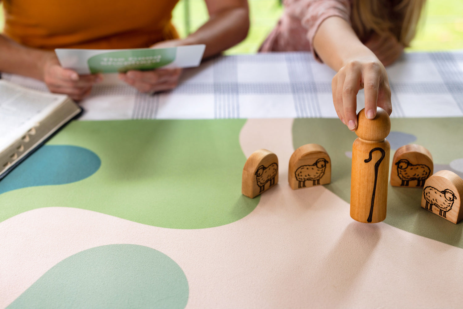 Each story kit combines wooden figures, a story mat, and teaching cards to bring 6 Bible stories to life. Every kit explores Old and New Testament passages to help tell one unified story of God’s rescue and redemption.