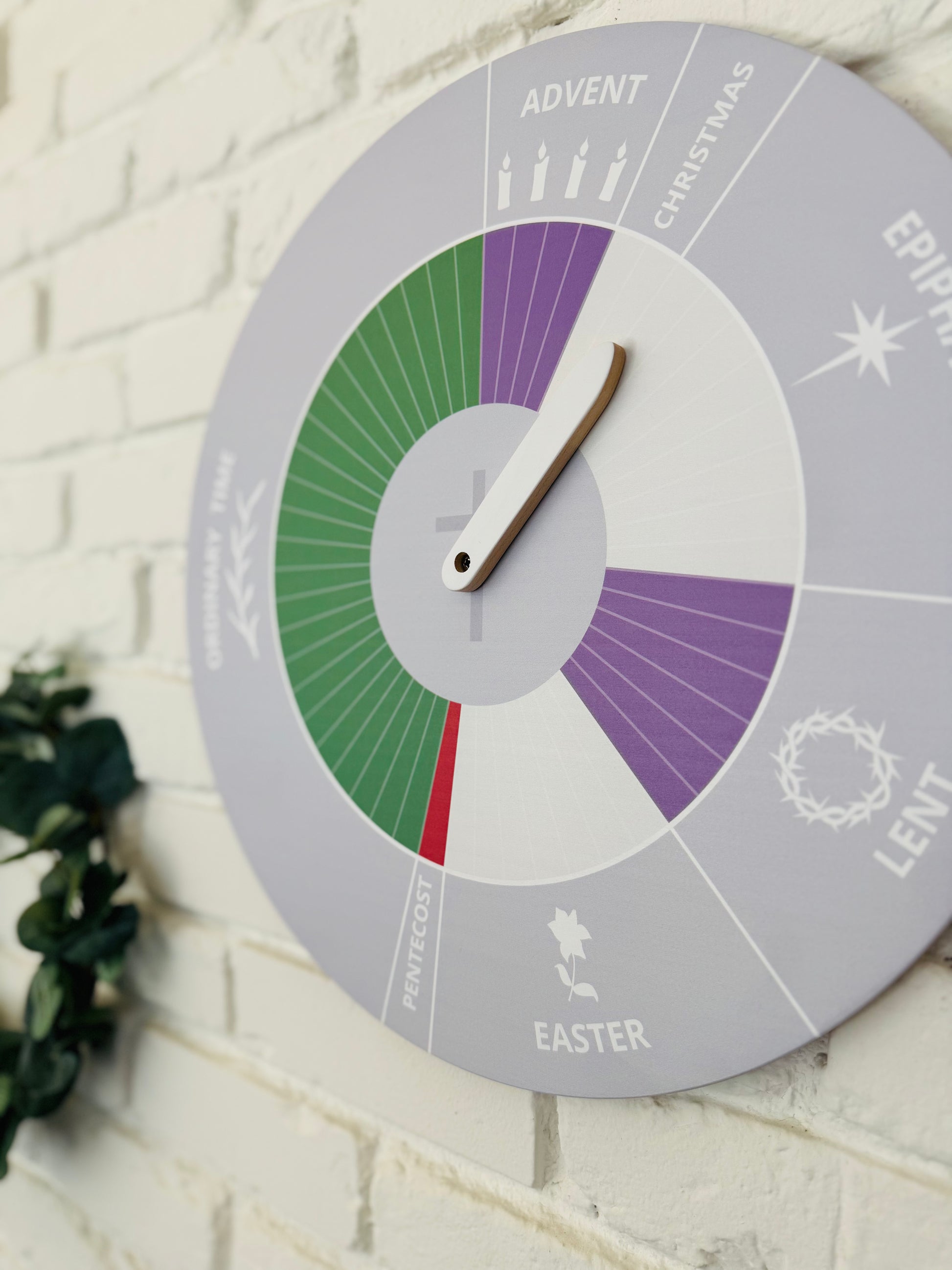 The Church Year wall hanging is a handy tool designed to help visualize the liturgical year. It is made from 1/2” maple hardwood and finished with a lacquer. It has a movable 'arrow' that can be moved to follow along with the corresponding week of the church year. It also has a keyhole on the back for easy wall installation, making it a great resource for home or church room use.