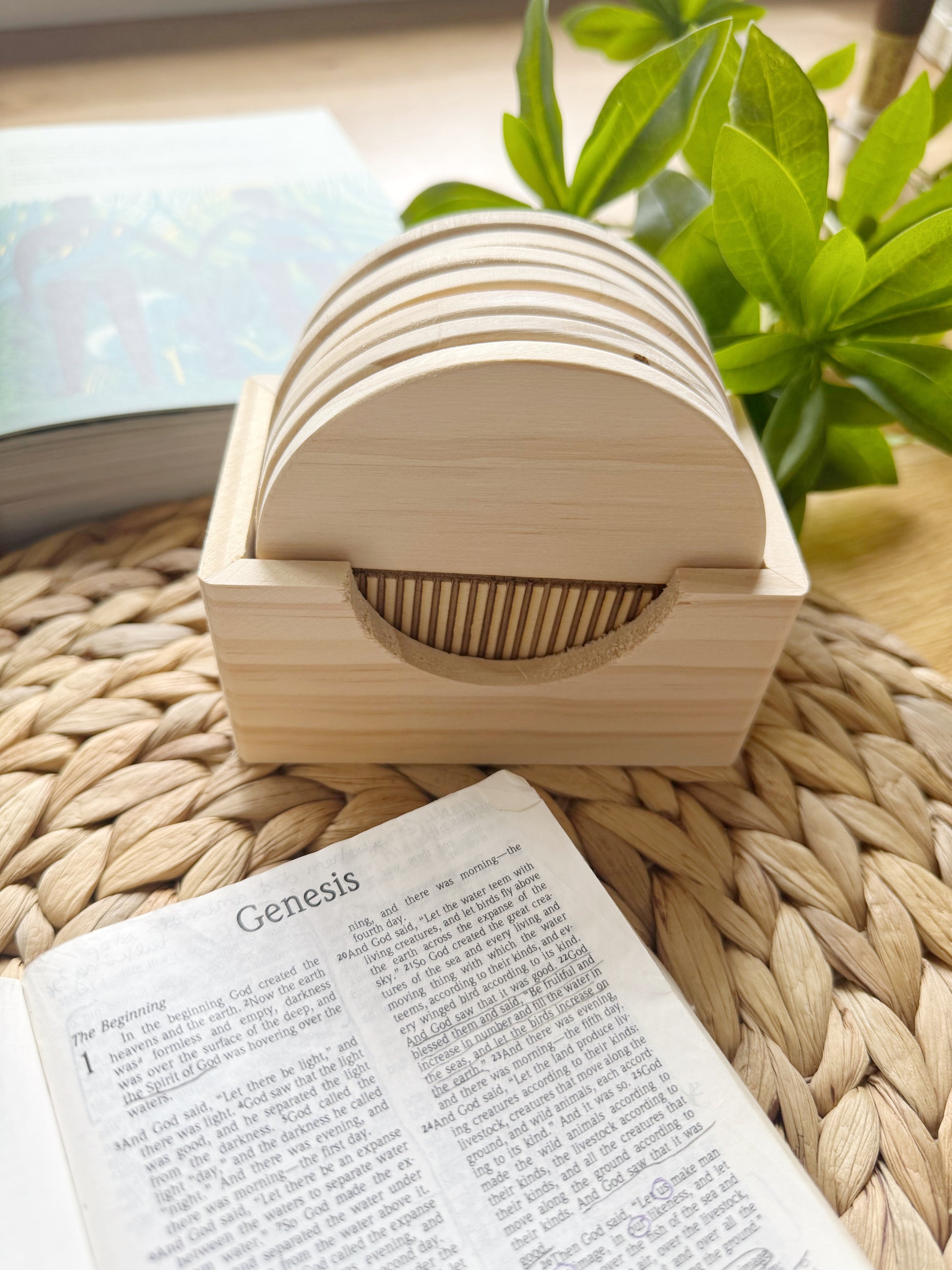 It includes 7 chunky wooden discs (diameter of 4”, 3/4” thick each) and a holder to keep them in. Each disc contains an engraved image on the front and a corresponding numbered day on the back.