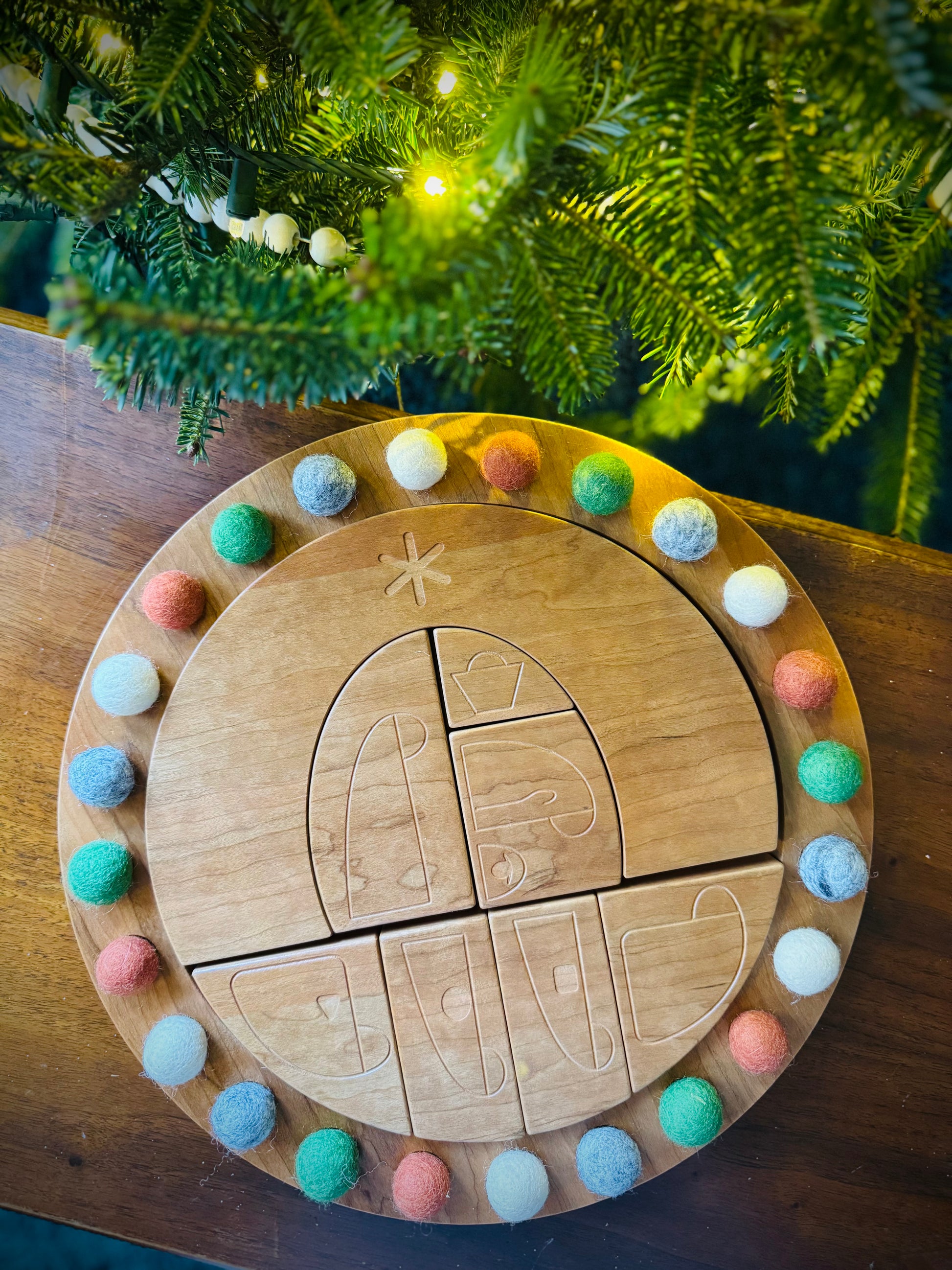The wreath tray includes 24 dimples for holding 1” felt balls to count down the days in December until Christmas.