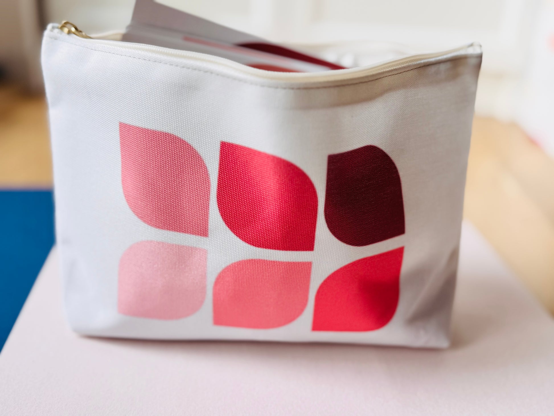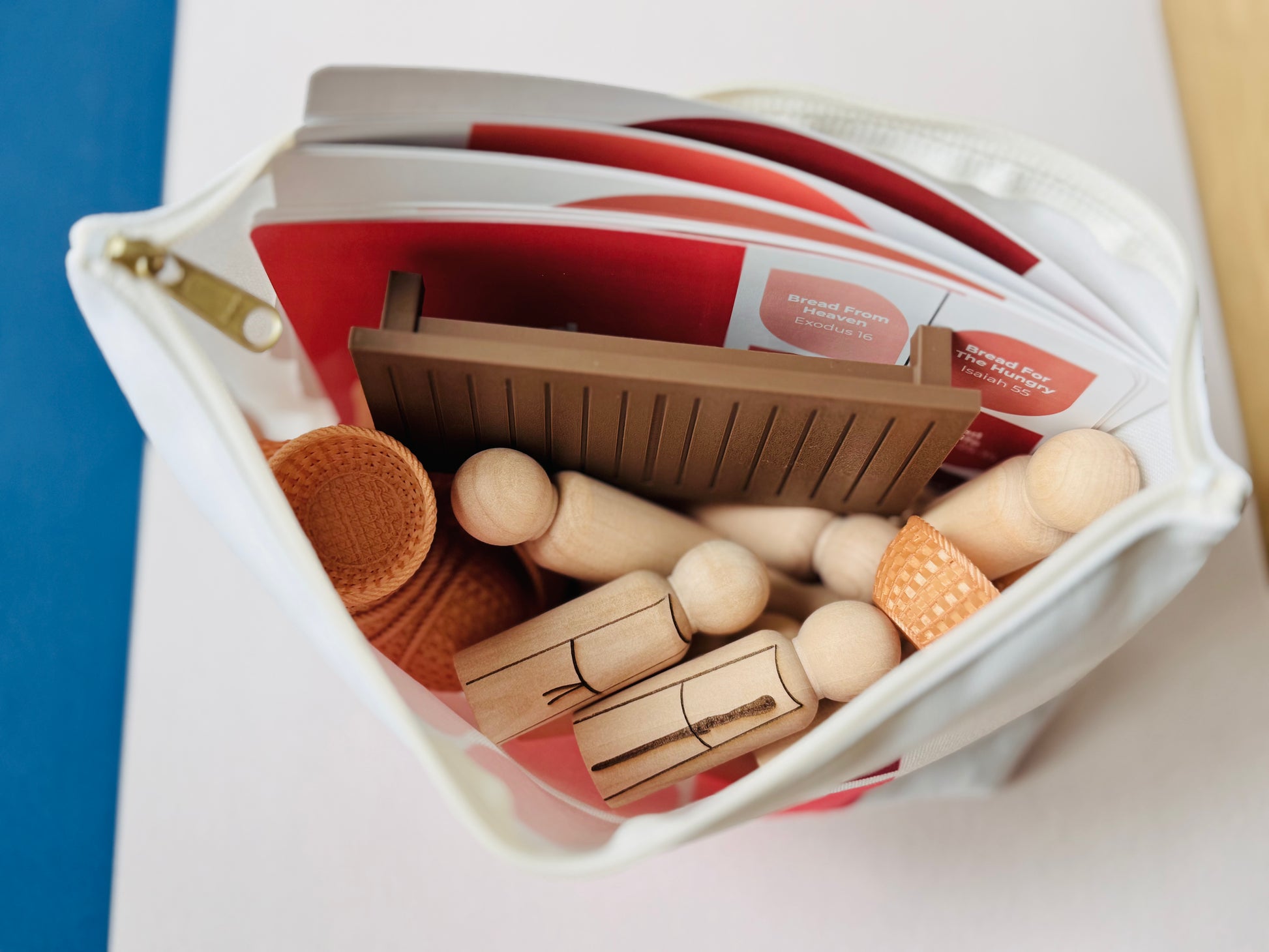 Double-sided pouch featuring path Lenten red hues. Durable polyester with zipper closure—perfect for storing all figures and story cards.