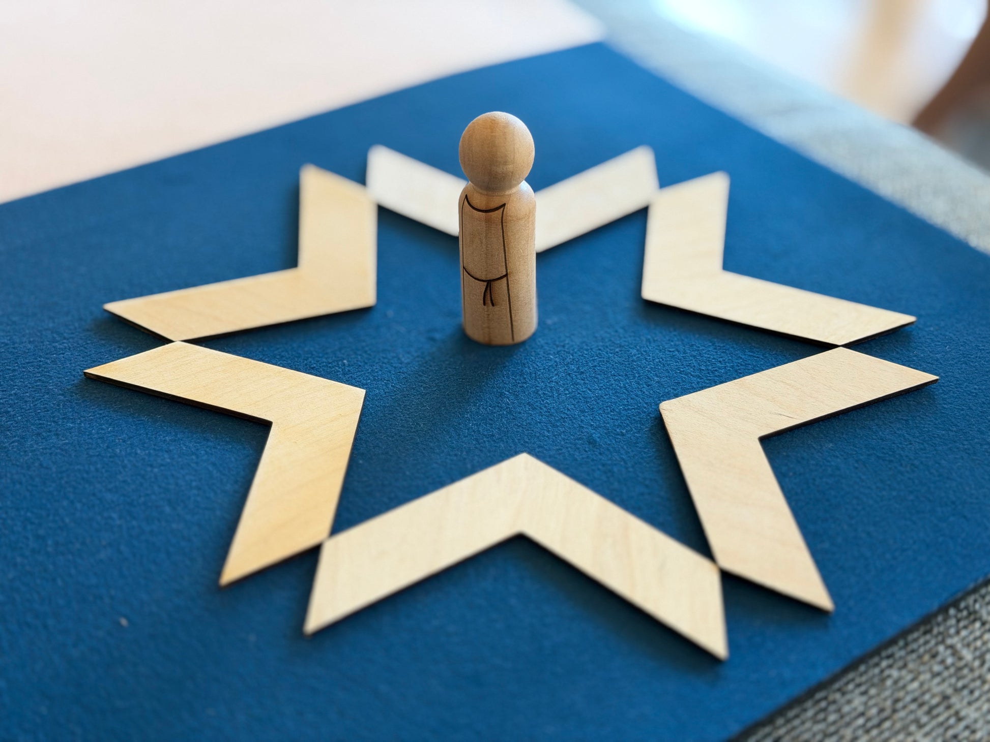 The two toned story mat acts as simplified dark / light visual and story scene for the stories to be re-enacted. The mat has a felt-like polyester top with a non-slip rubber base. It provides a beautiful, durable foundation for storytelling. (Note: this story mat is used in multiple story sets, so it is versatile!)